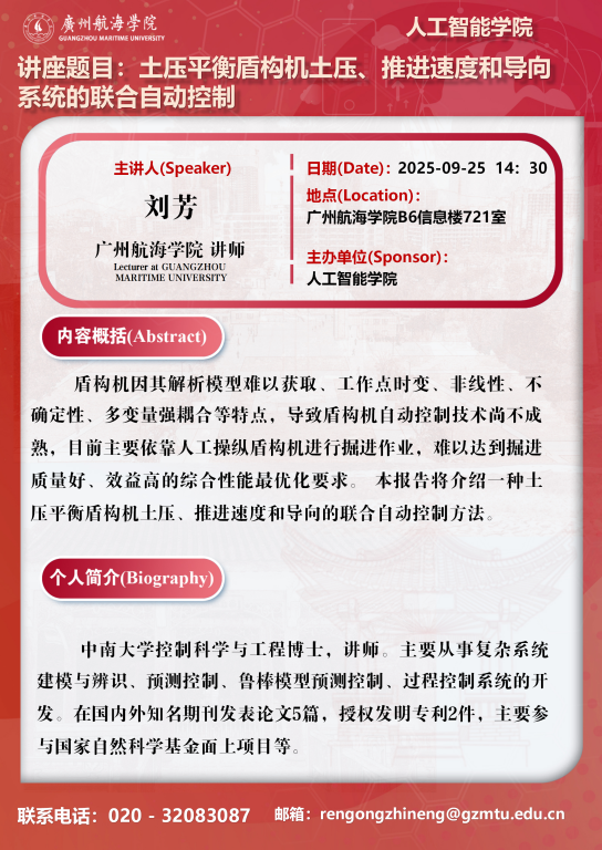 学术讲座预告:刘芳《土压平衡盾构机土压、推进速度和导向系统的联合自动控制》